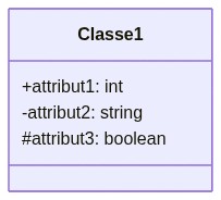 Un attribut est une caractéristique ou une propriété distincte d'une classe qui décrit l'état de l'objet. Les attributs sont notés dans la partie centrale de la boîte de la classe, avec un nom en minuscules et un type indiqué après le nom. La visibilité de l'attribut est indiquée par un symbole devant le nom de l'attribut :