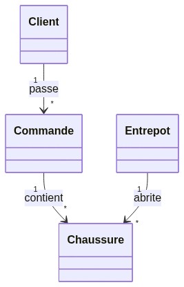 Enfin, il est important de définir les relations entre les différentes classes. Dans notre exemple, la classe Entrepôt est reliée à la classe Chaussure par une relation "abrite" et la classe Commande est reliée à la classe Client par une relation "passe".