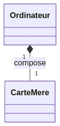 Un ordinateur est composé d'une carte mère. Cela signifie qu'un ordinateur ne peut pas fonctionner sans carte mère, et une carte mère ne peut pas fonctionner sans ordinateur. C'est une relation de composition.