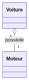 Une voiture possède un moteur. Cela signifie qu'une voiture peut potentiellement fonctionner sans moteur, mais un moteur ne peut pas fonctionner sans voiture. C'est une relation d'agrégation.